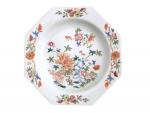 CHINE Compagnie des Indes Suite de six assiettes creuses octogonales en porcelaine à décor famille rose de fleurs XVIIIème D.: 21.5 cm (fêle, petites égrenures)
