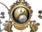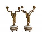 GARNITURE DE CHEMINEE en marbre blanc et bronze doré, la pendule portique figurant deux angelots portant un palanquin sur lequel est posé la pendule, elle-même surmontée d'une guirlande de fleurs, feuilles, colombes, carquois, cases et torche, le cadran émaillé à quantièmes signé "Vaillant à Paris", les candélabres figurant chacun un angelot tenant deux bras de lumière