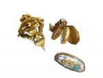 2 BROCHES anciennes or et nacre, on y joint un pendentif avec chaine (interieur verre) poids brut 19.6 g