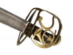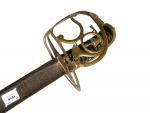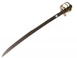 Sabre de Chasseur, type petit Montmorency. Poignée recouverte de cuir, à filigrane en cuivre. Monture en laiton. Calotte à longue queue. Garde à une branche principale, deux secondaires décorées d'un cor et bonnet de la Liberté. Lame courbe, à pans creux et gouttière. EM SF (lame piquée)