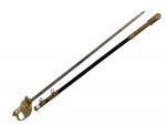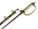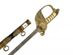 Sabre de Cadet de la Marine allemande. Poignée en bois laqué, avec filigrane. Monture en laiton, ciselé. Calotte à longue queue, surmontée d'une tête de lion. Garde une branche, à coquille décorée d'écailles et dans un réserve d'une ancre couronnée. Lame à deux tranchants et gouttière centrale, gravée à la moitié. Fourreau recouvert de cuir, à trois garnitures en laiton, ciselé. ABE (usures)