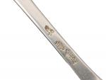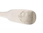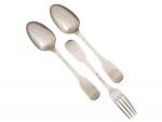 Suite de deux CUILLERES et une FOURCHETTE en argent, modèle uniplat, gravées d'armoiries d'alliance sous un heaume de chevalier Saint Omer, fin XVIIIème Maitre orfèvre: LF une fleur Poids: 176 gr