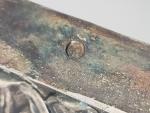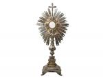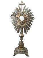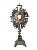 OSTENSOIR en argent, la base à décor d'une frise de palmettes reposant sur quatre pieds griffes, le fût annelé, la partie supérieure à décor d'une gloire entourée d'angelots dans les nuées surmontée d'une croix
