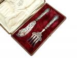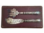 COUVERT de service à poissons en argent fourré et métal argenté Minerve L.: 27.5 et 29.5 cm Poids brut: 268 gr (dans son écrin d'origine à la forme)