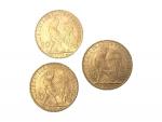3 pièces or, 20 francs, 1905, 1906, 1914, coq Lot conservé en banque, vendu sur désignation