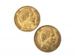 2 pièces or, 20 francs, 1854 Paris, 1859 Paris Napoléon III tête nue Lot conservé en banque, vendu sur désignation