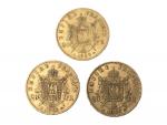 3 pièces or, 20 francs, 1864 Paris, 1866 Paris, 1868 Paris Napoléon III têtte laurée Lot conservé en banque, vendu sur désignation