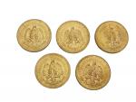 Lot de 5 pièces de 50 pesos mexicaines en or Lot conservé en banque, vendu sur désignation