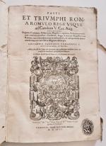 (Livre illustré du XVI siècle) PANVINIO (Onofrio) Fasti et triumphi Rom[ani] a Romulo rege usque ad Carolum V. Caes. Aug. sive Epitome Regum, Consulum, dictatorum, magistror[um] equitum, tribunorum militum consulari potestate, censorum, Imp[eratorum] & aliorum magistratuum Roman[orum] cum orientalium tum occidentalium, ex antiquitatum monumentis maxima cum fide ac diligentia desumpta (...). Additae sunt suis locis Imp[eratorum] & orientalium, & occidentalium verissimae icones, ex vetustissimis numismatis quam fidelissime delineatae. Ex Musaeo Iacobi Stradae Mantuani, civis Romani, antiquarii Venice, Mantuani, 1557.