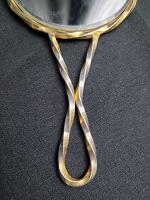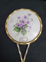 - Miroir à main décor floral en porcelaine de Limoges la dorure est patinée hauteur 20,5 cm .