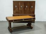 Cabinet de travail en bois naturel et bois de placage, agrémenté d'une ornementation de bronzes dorés, comprenant un bureau plat et une armoire à quatre portes