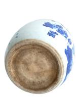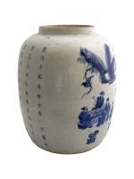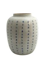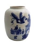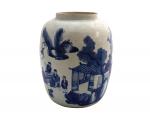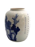 Importante jarre en porcelaine blanche à décor en bleu sous couverte de trois dignitaires autour d'une table à jeux et un serviteur près d'une habitation. Un poème calligraphié d'après Su Dongpo (1037-1101) évoquant les plaisirs de la vie complète l'ornementation.
