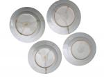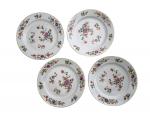 CHINE Compagnie des Indes Suite de quatre assiettes rondes en porcelaine à décor famille rose XVIIIème D.: 23 cm (égrenures et fêles)