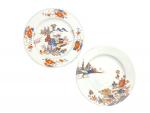 CHINE Deux assiettes rondes en porcelaine à décor Imari XVIIIème D.: 23 cm (fêle, petites égrenures)
