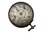 MONTRE en argent avec sonnerie fonction réveil. Boîtier sur charnière, la carrure ciselé de motifs feuillages. Cadran argenté avec deux carrés de remontage pour la sonnerie et l'indication des heures, chiffres romains, disque de réglage pour la fonction réveil. Mouvement avec remontage à clef, échappement à verge (manque le coq).