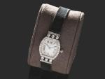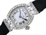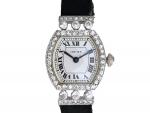 MONTRE bracelet de dame en platine (950) et diamants. Boîtier fond fermeture à vis avec un entourage de brillants, porte le poinçon de maître " EJ ". Cadran blanc avec chiffres romains, minuterie chemin de fer au centre. Mouvement mécanique rapporté non d'origine, calibre ETA signé Cartier, 17 rubis. Fermoir déployant en or rose et blanc serti de brillants. Un étui de service de la maison Cartier.