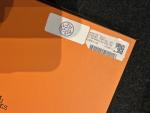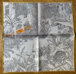 HERMÈS Paris " Faubourg tropical " par Théo de Gultel et Octave Marsal Carré en soie imprimée à fond anthracite et ciel avec bordures couleur or. 45 x 45 Gavroche avec boite
