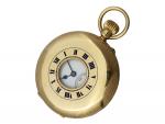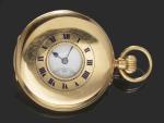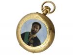 MONTRE demi savonnette en or 18k (750) à l'effigie de l'empereur d'Éthiopie Haïlé Sélassié 1er. Boîtier sur charnière, ouverture sur le capot pour la lecture de l'heure avec chiffres romains et minuterie chemin de fer, au dos un émail polychrome représentant la figure de l'empereur d'Éthiopie. Les lettres et chiffres à l'intérieur du boîtier pour les poinçons de garantie correspondent à l'année 1937. Cadran émail blanc avec petite trotteuse pour le battement des secondes. Mouvement avec remontage à clef, échappement à ancre, platine trois quarts signée " Goldsmiths & Silversmiths Company Ltd, 112 Regent St, London ".