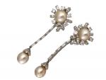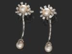 PENDANTS d'oreilles en or gris, au centre une perle (état moyen) entouré de diamants, les pendants pouvant s'enlever sertis de diamants baguette poids 18.2 g haut 6 cm