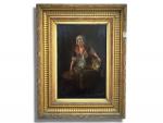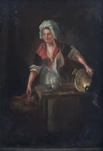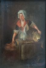 ECOLE FRANCAISE vers 1800 La récureuse de cuivres Huile sur panneau 25 x 17.5 cm