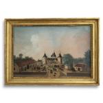 ECOLE FRANCAISE du XIXème Départ pour la chasse à courre devant le château Gouache sur carton 26.5 x 40.5 cm à vue