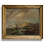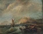 ECOLE FRANCAISE fin XIXème Bateaux dans la tempête près des côtes Huile sur toile 46 x 55 cm (petites restaurations)