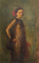 Lucien MIGNON (1865-1944) Portrait d'une élégante Huile sur toile signée en haut à droite 61 x 39 cm (petits manques, craquelures)