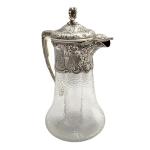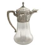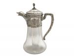 BROC A ORANGEADE couvert en cristal et argent, à décor de scènes de taverne et de feuillage Apparemment sans poinçon H.: 33 cm Poids brut: 2 kg 630 (complet de son réservoir intérieur)