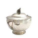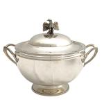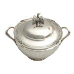 SOUPIERE couverte en argent uni, reposant sur un piédouche, à décor de filets, feuillage, torche encadrée de deux ailes, le couvercle surmonté d'une prise en forme d'aigle
