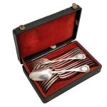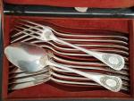 Suite de six COUVERTS en argent à décor chiffré en médaillon perlé, dans un entourage de coquille et guirlande florale Minerve. Orfèvre: Jean GRANVIGNE (1868-1910) Poids: 990 gr (dans son écrin)