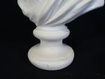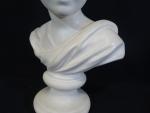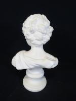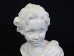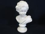 Buste de jeune garçon aux cheveux bouclés. Sculpture en terre-cuite blanche sur piédouche. H. 42 cm