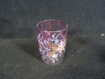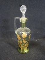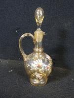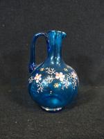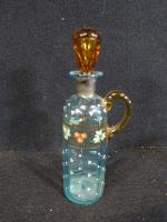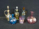 Ensemble de six pièces en verre émaillé à décor de fleurettes comprenant : trois carafes et leurs bouchons, un petit pichet de forme boule en verre teinté bleu, une carafe et un gobelet en verre teinté rose.