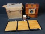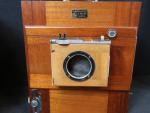 PHOTOGRAPHIE - DEMARIA - LAPIERRE et MOLLIER, constructeur, 3 boulevard Richards le Noir, PARIS - Chambre touriste en acajou (dimensions : 23x28) à parure en laiton chromé avec soufflet, plaques, objectif STYLOR vers 1920 (hauteur 33cm ; largeur 30cm).