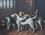 M. PAULOIS (début XXème) Les chiens Huile sur panneau signée en bas à droite 20.5 x 25.5 cm