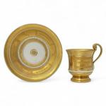 PARIS Tasse et sa soucoupe en porcelaine à décor or Epoque Restauration H. (tasse): 9.5 cm D. (soucoupe): 14.8 cm