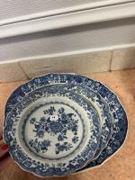 CHINE Lot comprenant un plat et deux assiettes en porcelaine à décor floral en camaïeu bleu XIXème siècle (fêles) Diam: 22 et plat: L: 34 cm