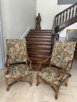 Paire de FAUTEUILS en noyer sculpté, à décor de coquilles et feuilles d'acanthe sur fond de croisillons, reposant que quatre pieds galbés reliés par une entretoise en X, style Régence