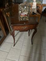 TRAVAILLEUSE en placage de bois de rose et marqueterie de cubes sans fond, de forme mouvementée, ornementation de bronze doré. Epoque Napoléon III (accidents) 75 x 61 x 43 cm
