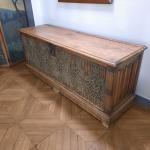 COFFRE en noyer de style néogothique à panneau à décor architecturé en orbevoie, façades latérales à décor de plis parchemin (parties anciennes, restaurations) 75 x 185 x 55 cm