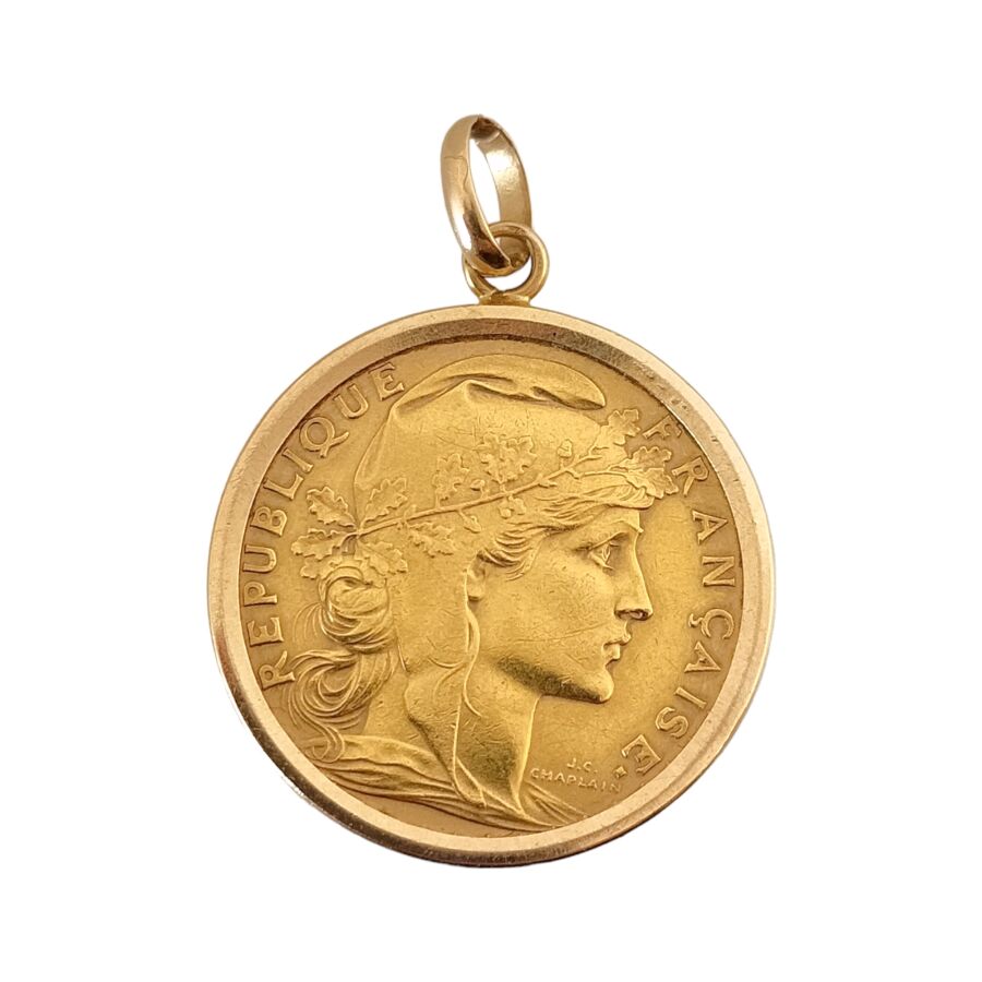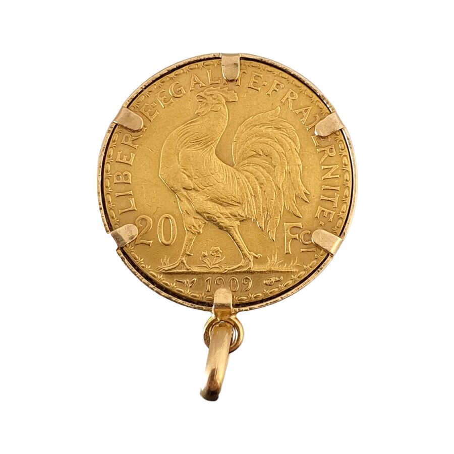 PIECE de 20 francs or au coq 1909 montée en pendentif or jaune 750/°°, pds: 7.8g Lot conservé en banque, vendu sur désignation