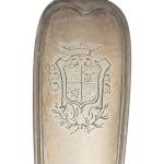 LOUCHE en argent, modèle filets, gravée d'armoiries sous une couronne de marquis XVIIIème L.: 38 cm Poids: 314 gr