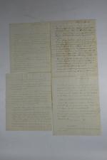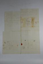 4 Lettres autographes signées (L.A.S.) de J. N. Corvisart adressées à son neveu par alliance Louis César Guichard, membre du corps législatif. 4 pp. - 3 pp. - 2 pp. - 1 p., toutes sur un double feuillet in-4, 3 avec adresse et marques postales. La première de Turin datée du 11 floréal an XIII (1 mai 1805) les autres de Milan les 19 floréal, 6 et 14 prairial an XIII. Il donne de ses nouvelles, des instructions pour l'administration de ses biens et s'entretient du projet d'achat par adjudication du domaine de la Faisanderie. " Si vous attendez l'adjudication, il faudra, je pense, se méfier des compères ; car il me semble bien possible que le vendeur fasse mettre deux hommes pour pousser l'un sur l'autre pour forcer le tiers à acheter plus cher ; il faudra que celui qui poussera pour moi soit profondément inconnu des vendeurs, sans cela nous serions encore dupes. (...) il faut un homme assez sûr pour ne pas se taire si on venait à lui proposer à l'oreille de l'argent ". " Ah ! ah ! M. Guéhéneuc me regrette ? J'en suis bien aise : il faisait le fier, quand j'étais là, j'ai voulu lui donner cette petite leçon, qu'il aille dans son beau monde, bien frisé, avec son beau chapeau à plumet, faire la roue ; bien du plaisir : que ça lui apprenne que la vie retirée et libre vaut mieux que son rôle de figurant ".
