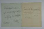 2 billets autographes signés de J. N. Corvisart. 1 p. in-8 du 28 juin 1814, " Mesdemoiselles Fanny la merdeuse, Elisa la glorieuse et Elise la goinfreuse sont invitées à venir passer la journée du dimanche prochain à la Garenne. Je les prie d'avaler mon entier dévoiement ". Une invitation à dîner au citoyen Charles profr. de physique, du 14 nivôse an X, 1 p. in-8 avec adresse, " (...) la fête sera complète si vous en faites partie. Je ne vous connais point d'excuses valables, ainsi acceptez ou craignez la colère d'un médecin ".