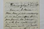 Louis-Napoléon BONAPARTE, 6 lettres de Xavier ULHMANN, attaché au prince comme valet de pied depuis 1857, adressées au baron Lucien Corvisart, 6 pp. in-8, Arenenberg (Suisse) 21 Août 1878, récit des excursions du prince depuis le 29 juillet ; les 5 autres lettres ont été écrite depuis l'Afrique du Sud, 2 billets (2 pp. demi in-8 chacun) ne sont pas datés, 3 pp. in-8 du 14 avril 1879, 2 pp. in-8 du 22 avril 1879 et 6 pp. in-8 du 8 juin 1879 avec son enveloppe, Mon Dieu je suis malheureux...