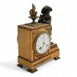 PENDULE en marbre jaune de Sienne et bronze patiné et doré, représentant un angelot appuyé sur une borne surmontée d'une flamme, le cadran émaillé Style Louis XVI, XIXème H.: 25.5 cm l.: 18.5 cm