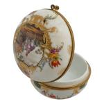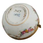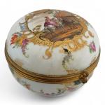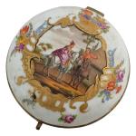 MEISSEN Boite couverte ronde en porcelaine à décor polychrome et or d'une rencontre équestre, la monture en métal doré H.: 6.5 cm D.: 9 cm