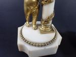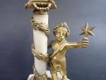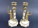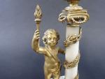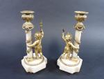 Paire de bougeoirs de style Louis XVI en bronze doré et marbre blanc représentant deux putti allégoriques au Jour et à la Nuit près de colonnes à guirlandes torses de feuilles de laurier, base à rangs de perles, ép. XIX's. Haut : 23 cm