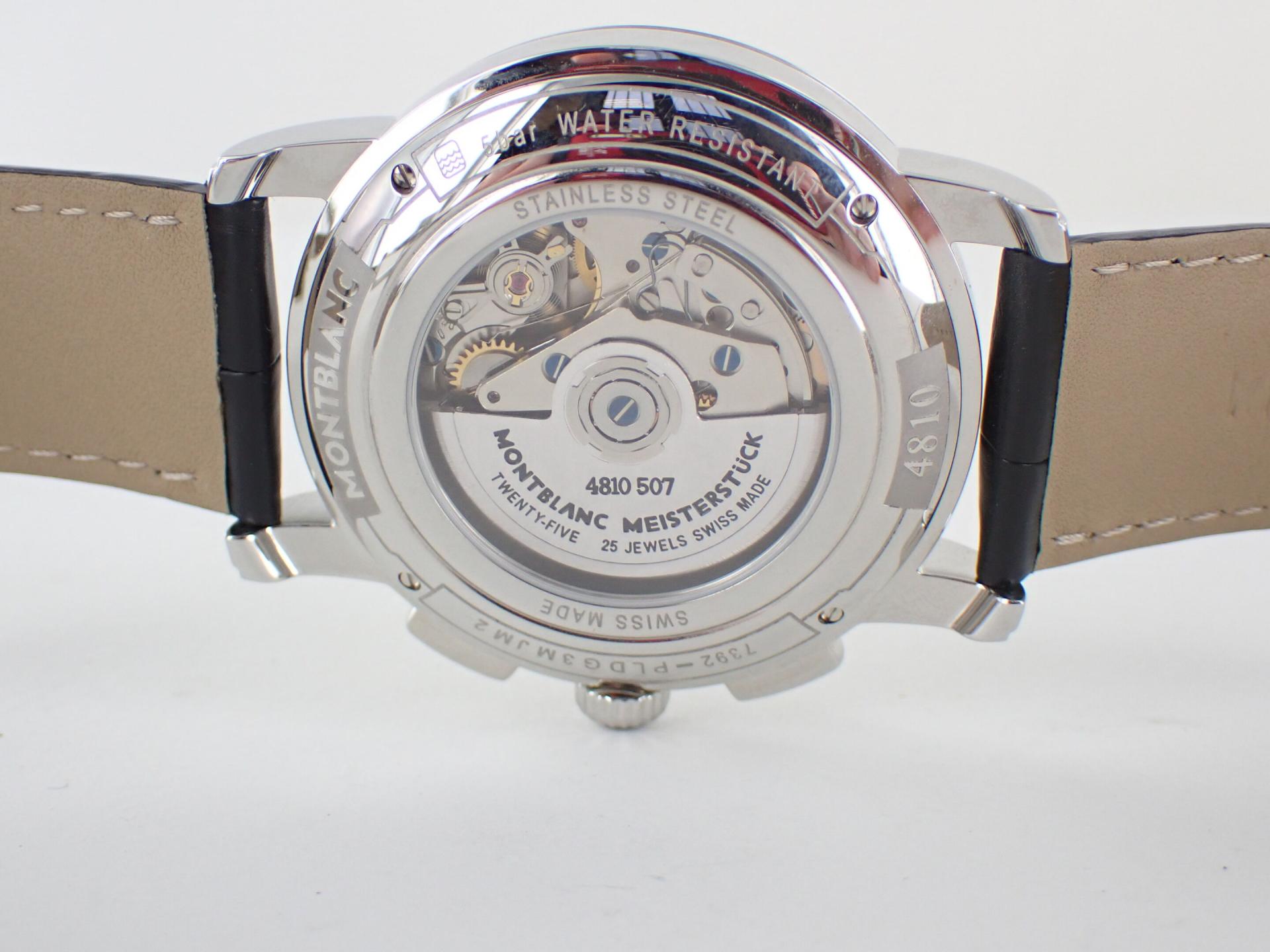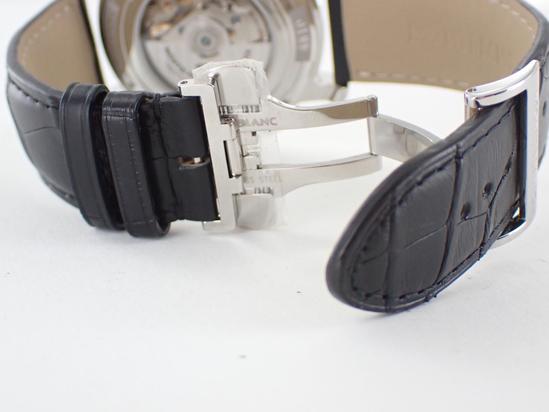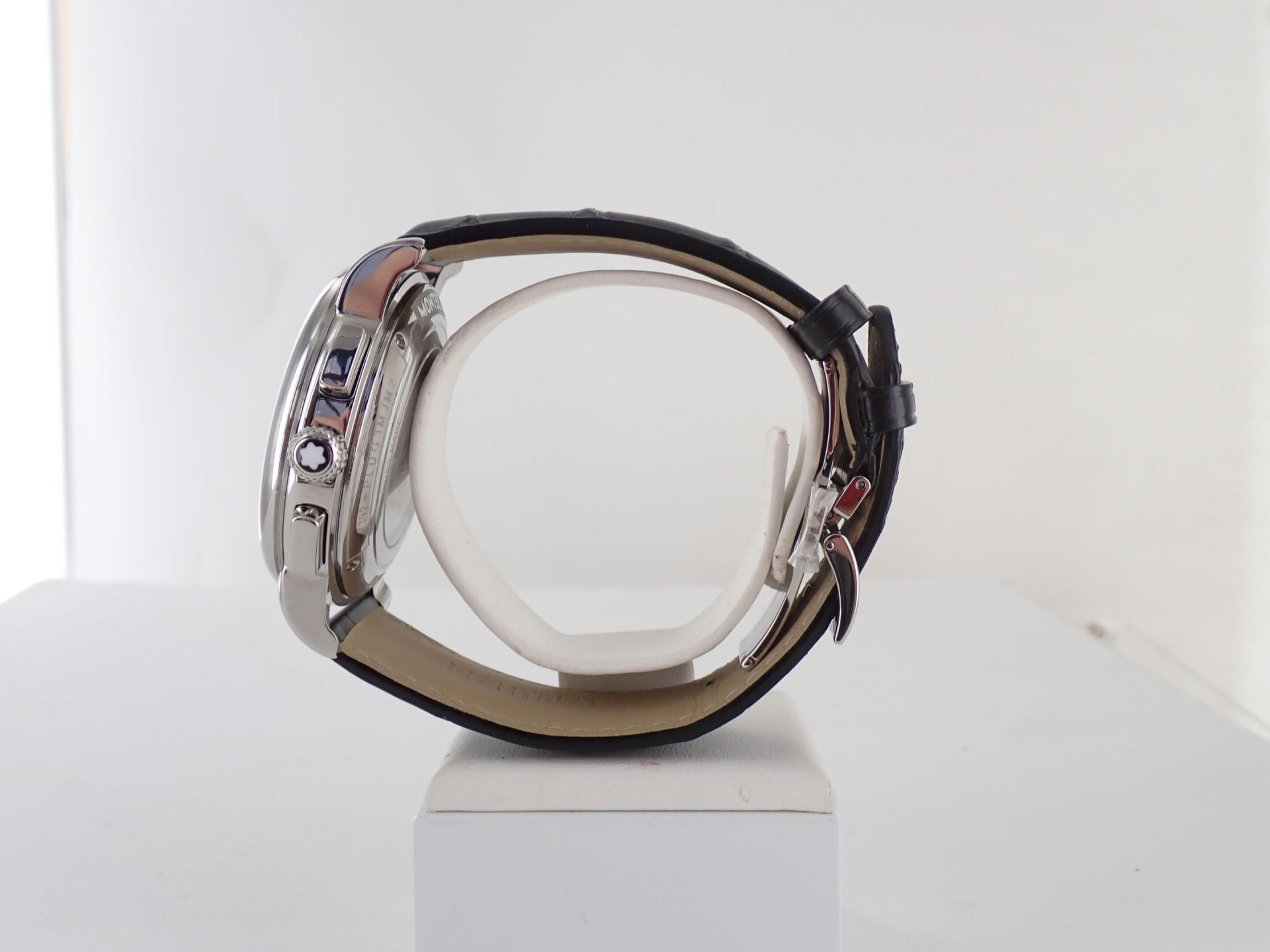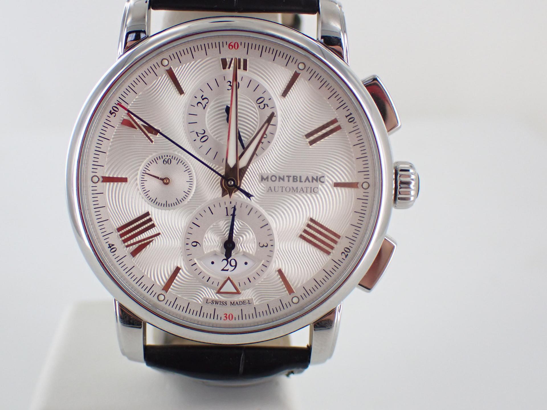 MONTBLANC - Montre bracelet d'homme chronographe modèle Star 4810. Boitier acier, bracelet cuir noir à surpiqures noir motif crocodile.