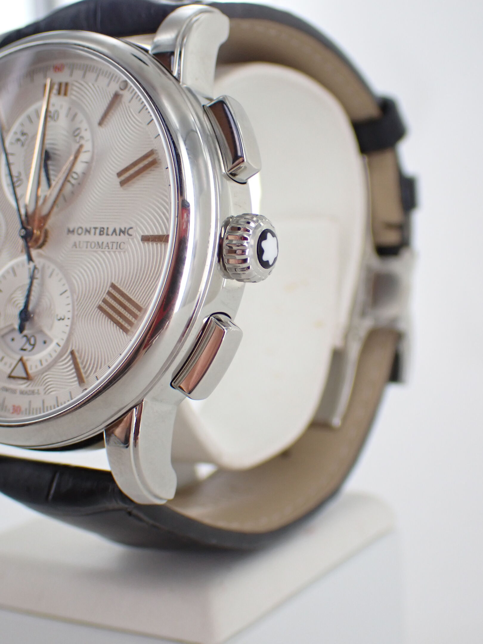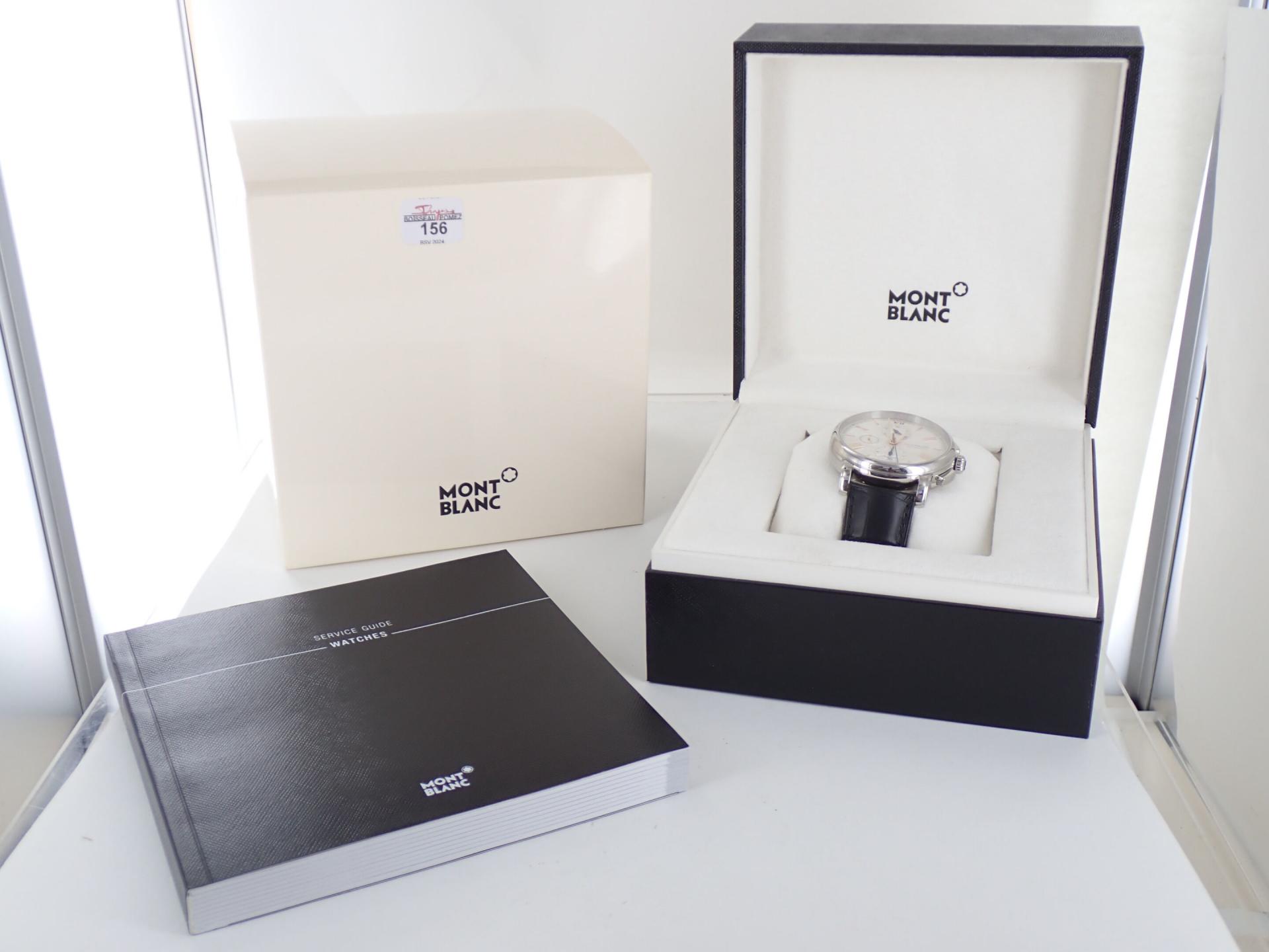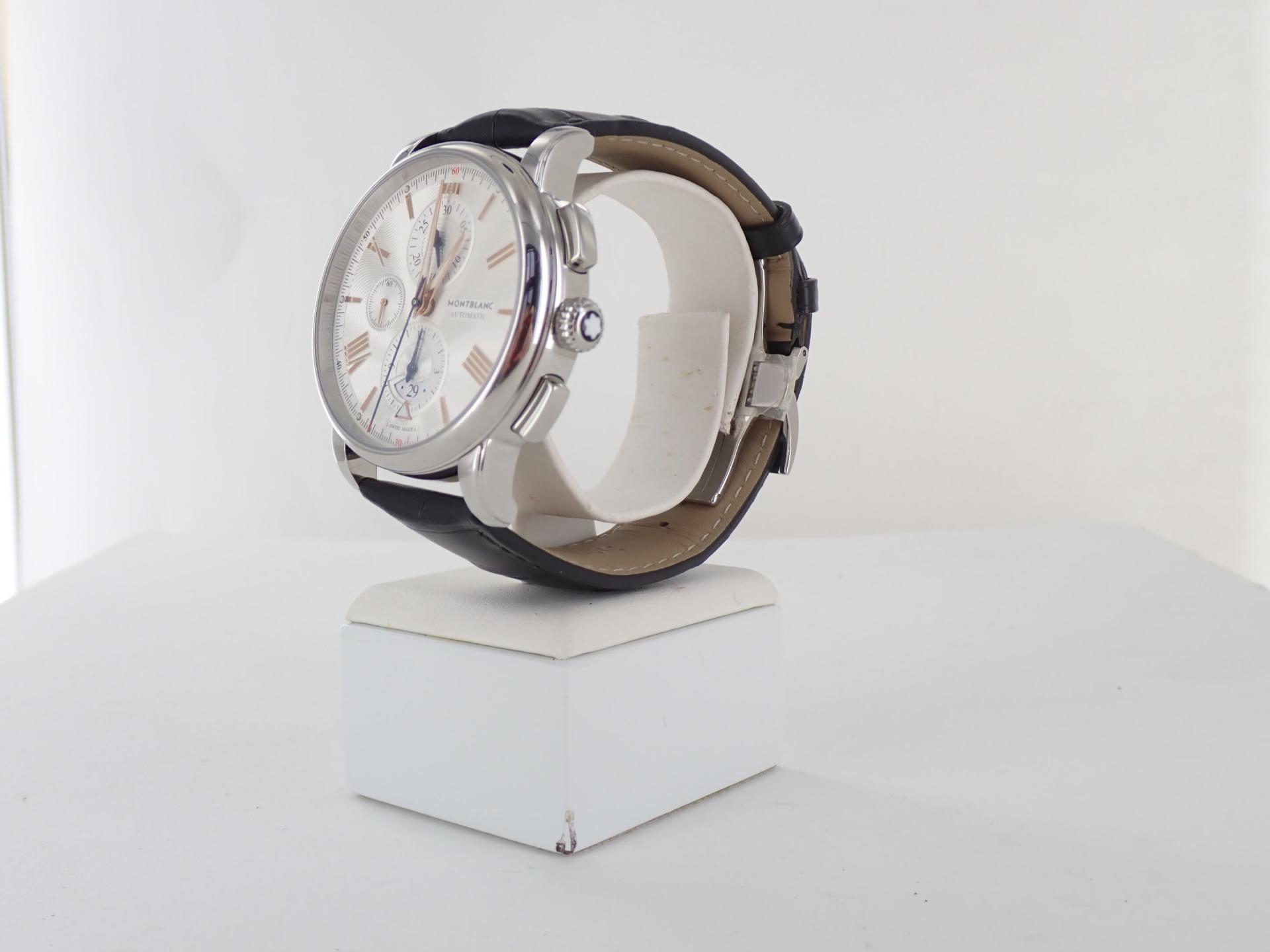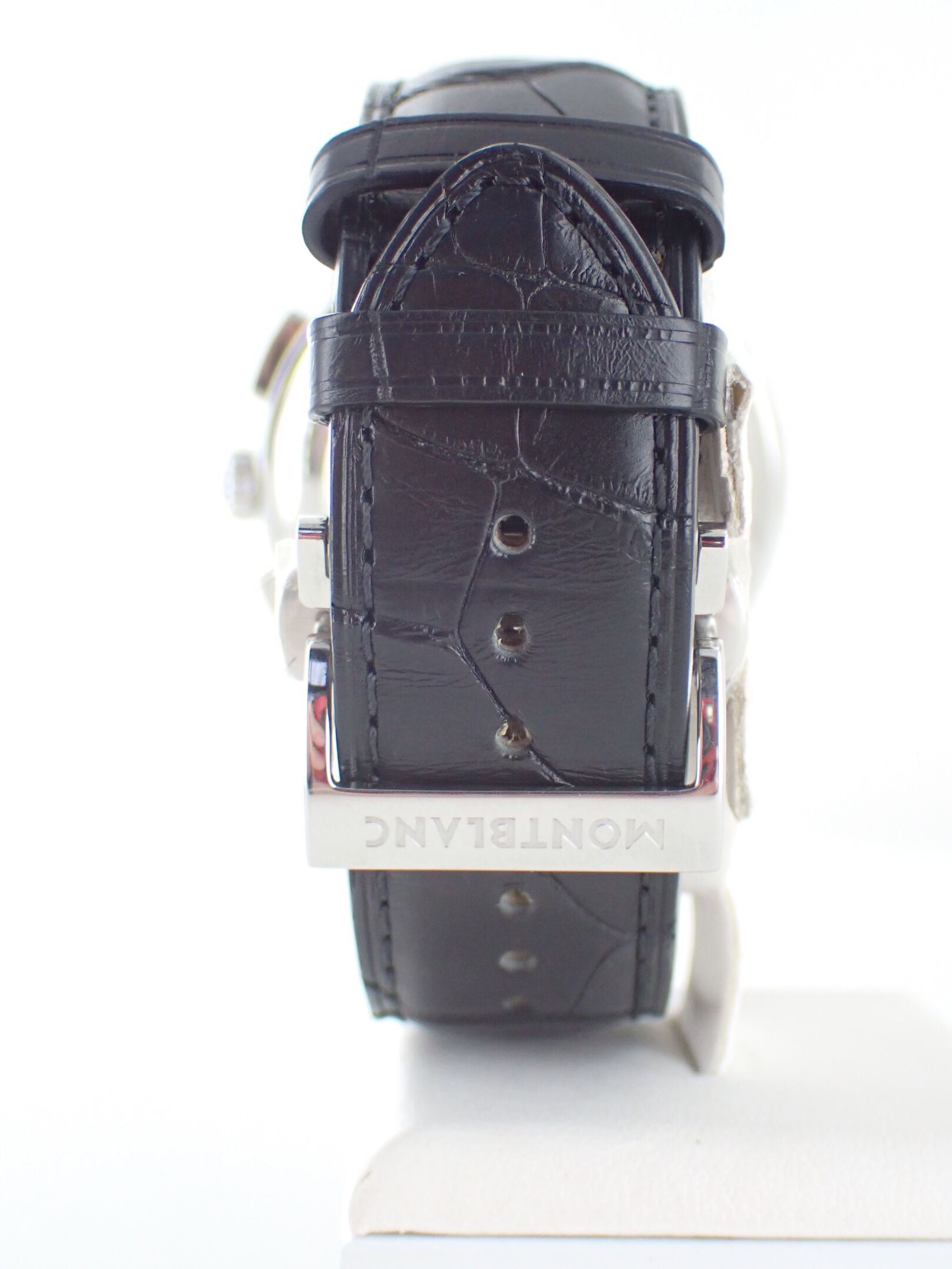 MONTBLANC - Montre bracelet d'homme chronographe modèle Star 4810. Boitier acier, bracelet cuir noir à surpiqures noir motif crocodile.