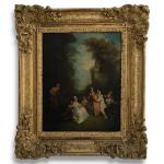 ECOLE FRANCAISE du XVIIIème, dans le goût de Jean Antoine WATTEAU Scène galante dans un parc Huile sur panneau 46 x 37.5 cm